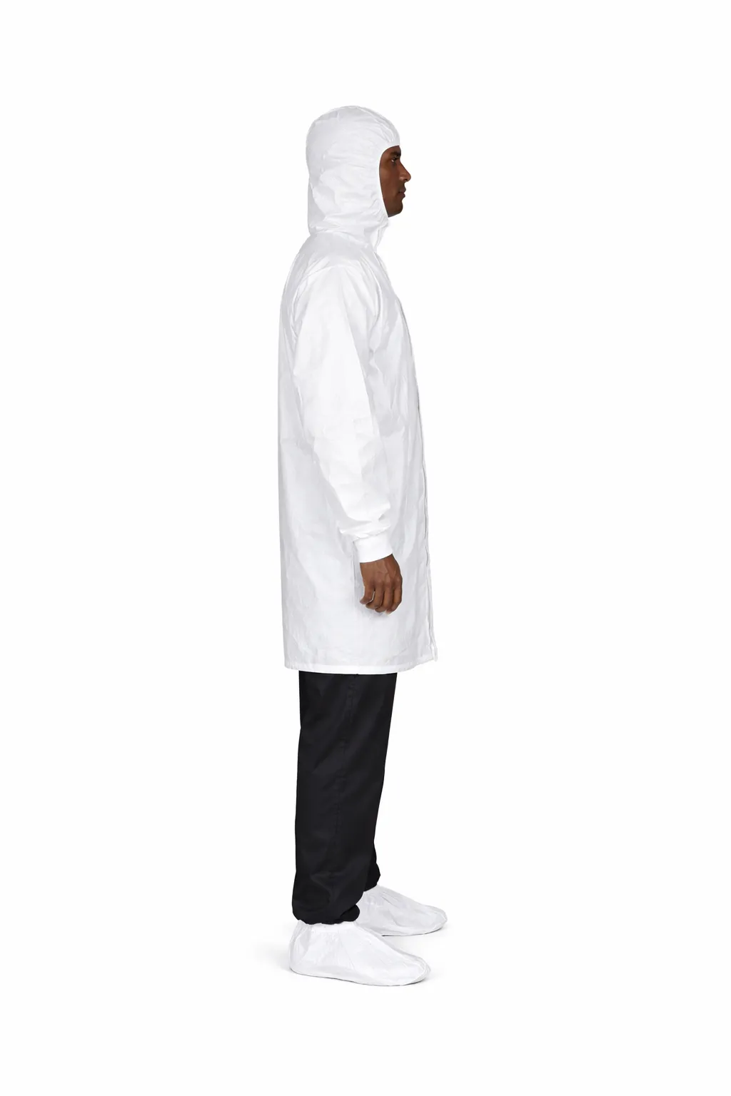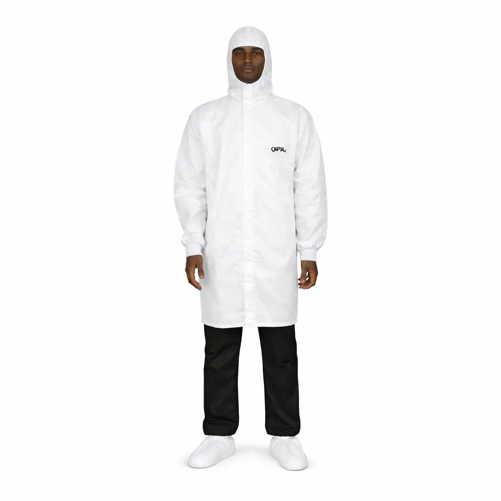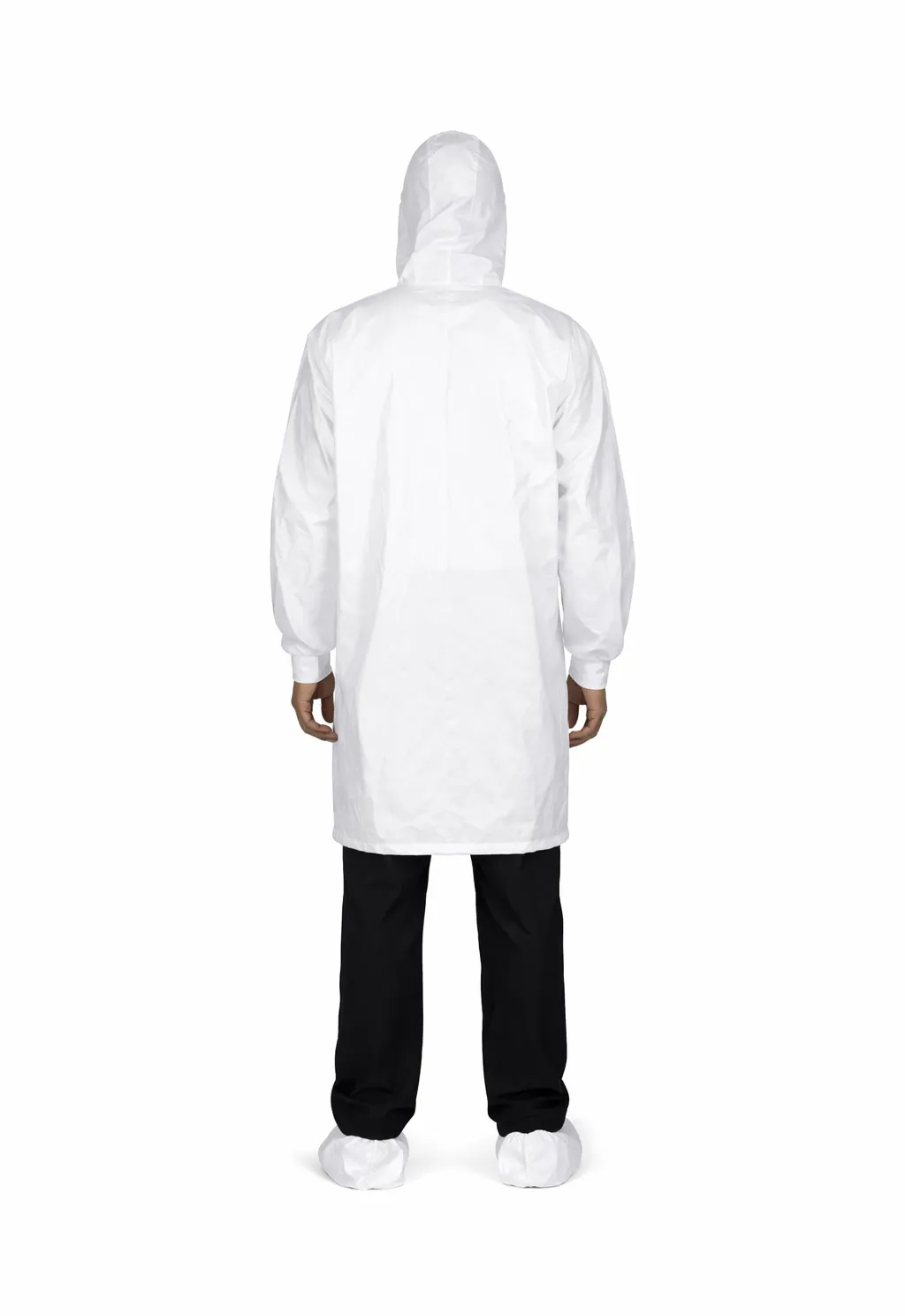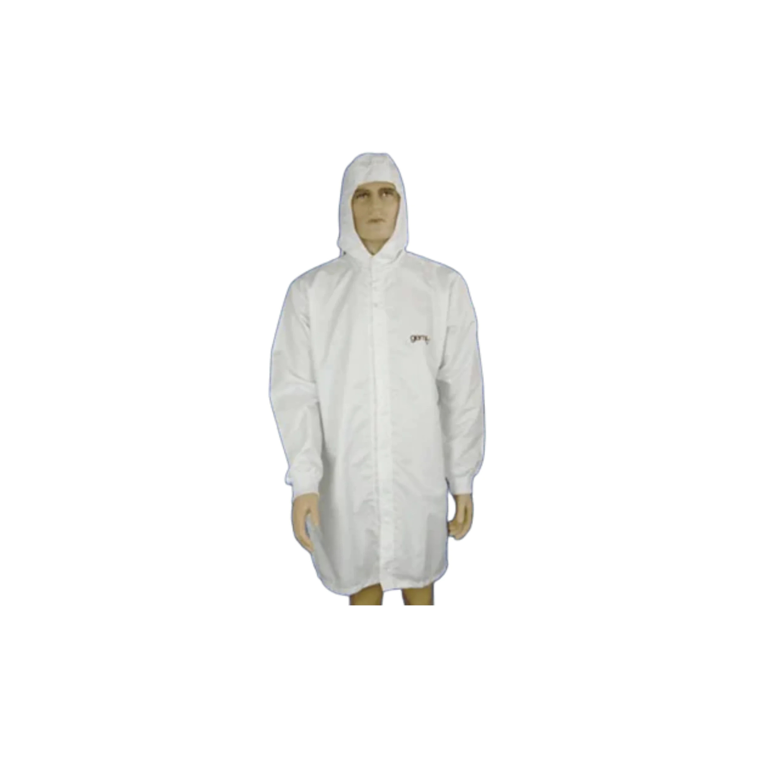 Avental de manga longa com fechamento frontal em zíper e capuz integrado, ideal para uso em salas limpas e ambientes controlados. Confeccionado em tecido 100% poliéster ou na versão 98% poliéster / 2% carbono, é um produto técnico, durável e desenvolvido sob encomenda, de acordo com as especificações do cliente.