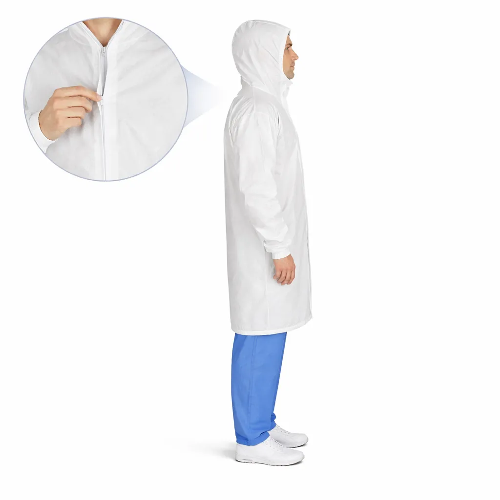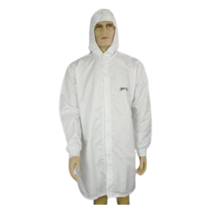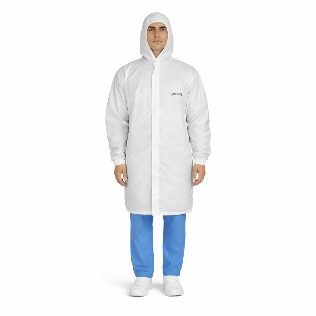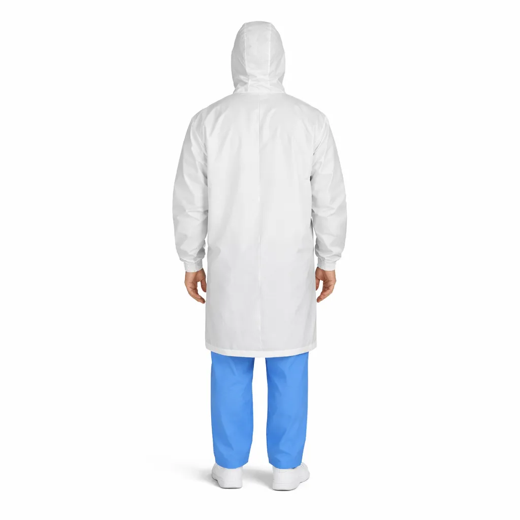 Avental técnico, tipo jaleco comprido, com capuz acoplado, desenvolvido para uso em ambientes controlados que exigem alto nível de higiene e proteção. Confeccionado em tecido 100% poliéster, resistente e de baixa liberação de partículas, é compatível com processos de esterilização e reutilização prolongada.