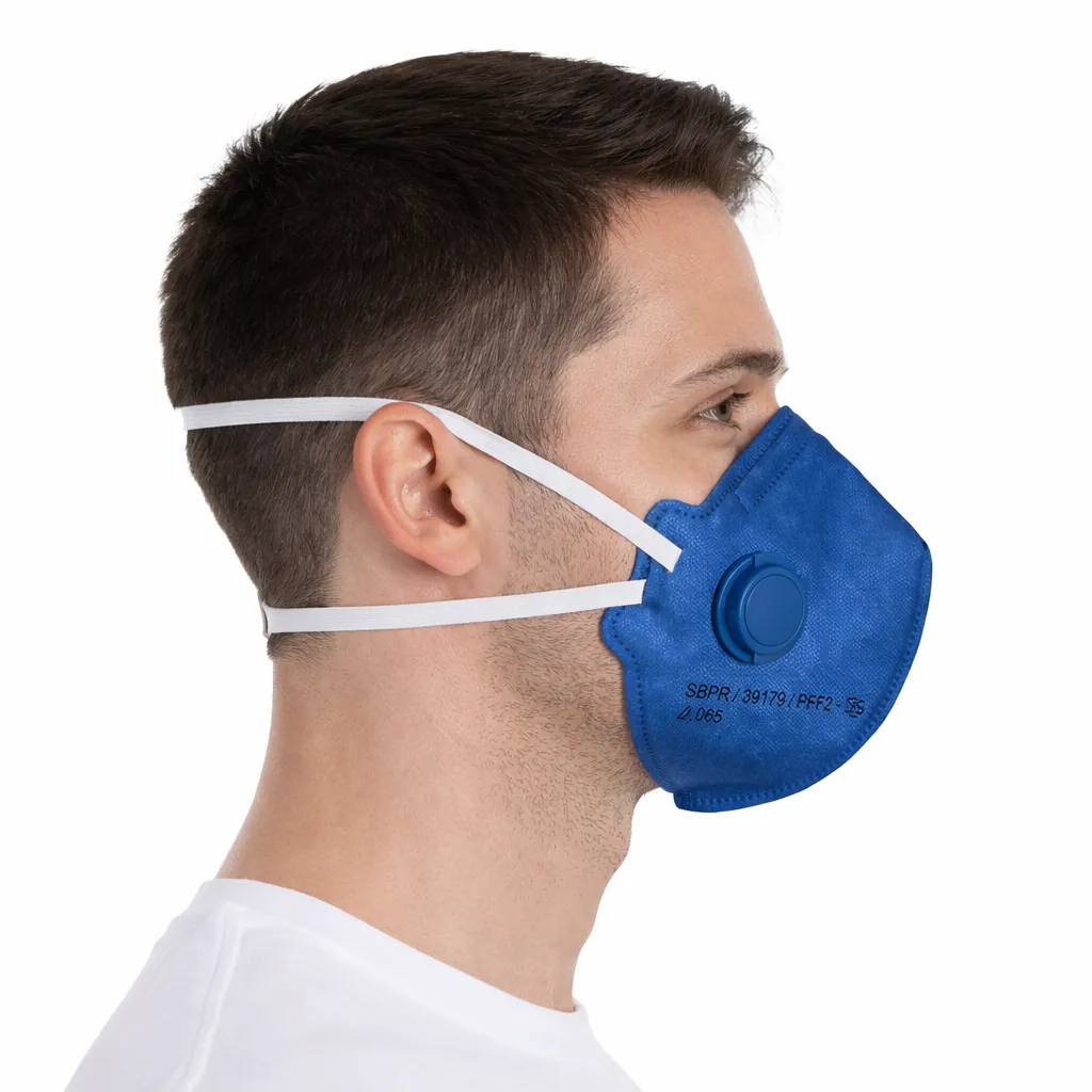 Máscara descartável tipo respirador purificador de ar, classe PFF-2S, confeccionada em múltiplas camadas de não-tecido, indicada para proteção das vias respiratórias contra partículas sólidas e líquidas à base de água.
