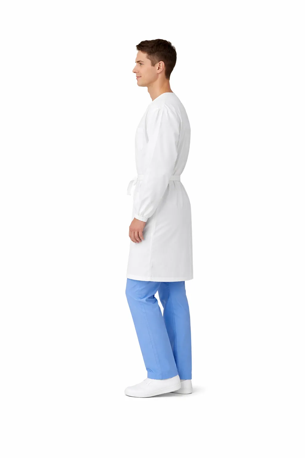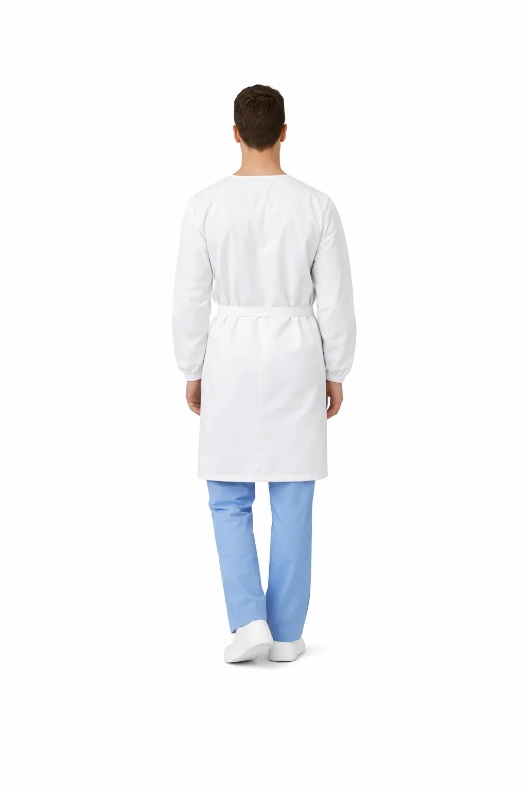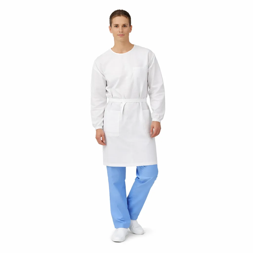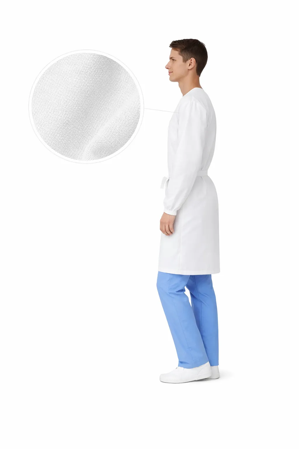 Avental descartável de manga longa confeccionado em tecido não tecido (TNT) 100% polipropileno, indicado para proteção superficial em diversos ambientes profissionais.