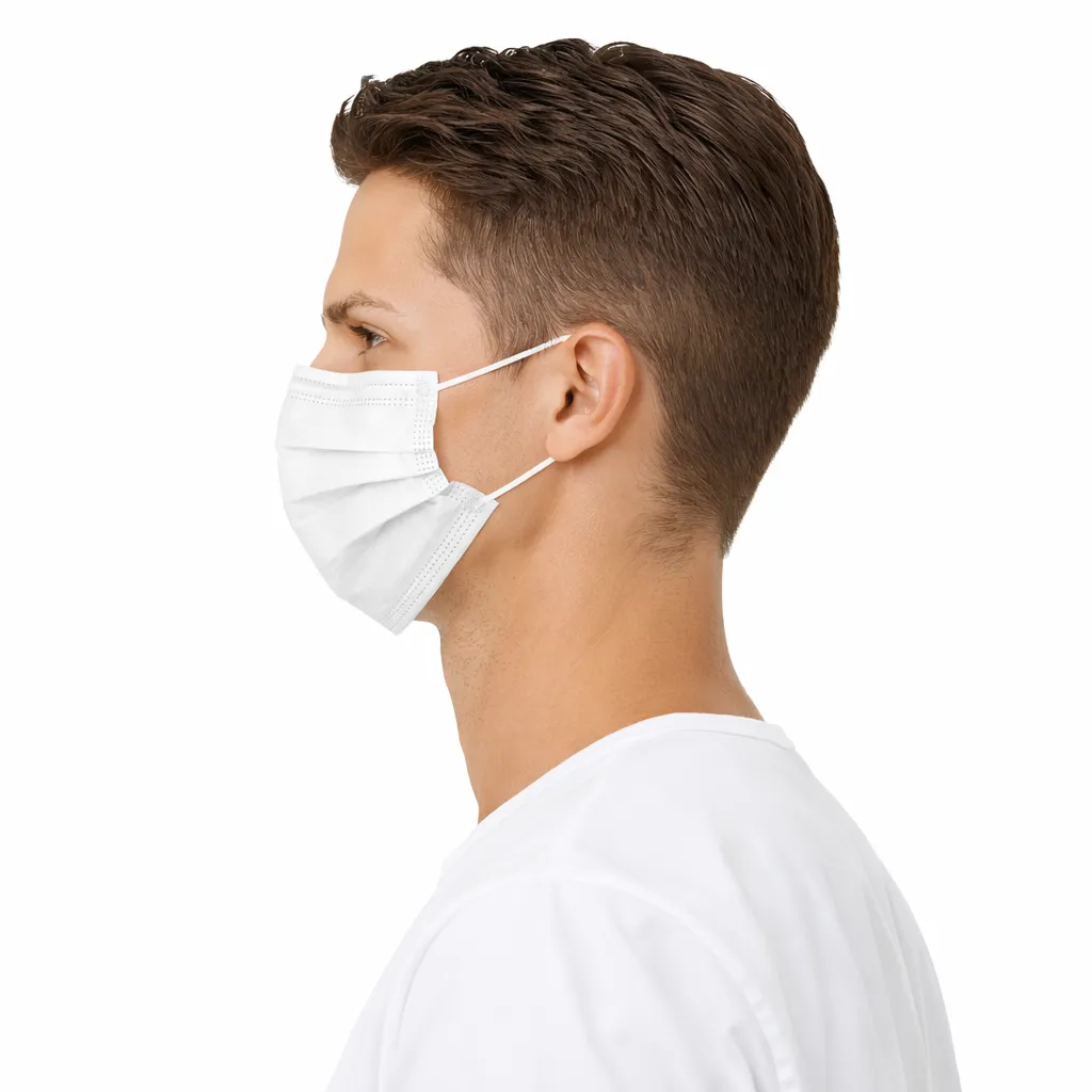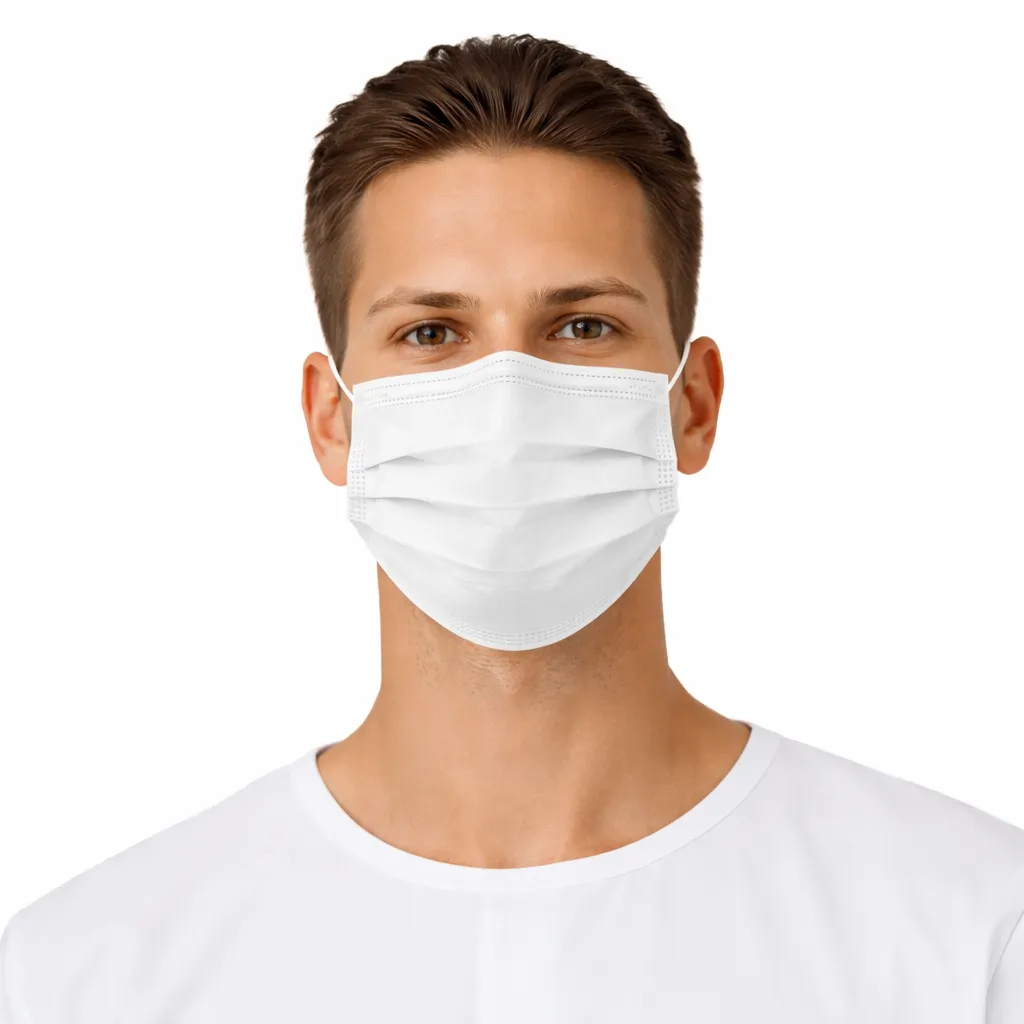 Máscara descartável dupla camada, confeccionada em tecido não tecido (TNT), indicada para proteção das vias respiratórias contra partículas, gotículas e projeção de fluídos.
