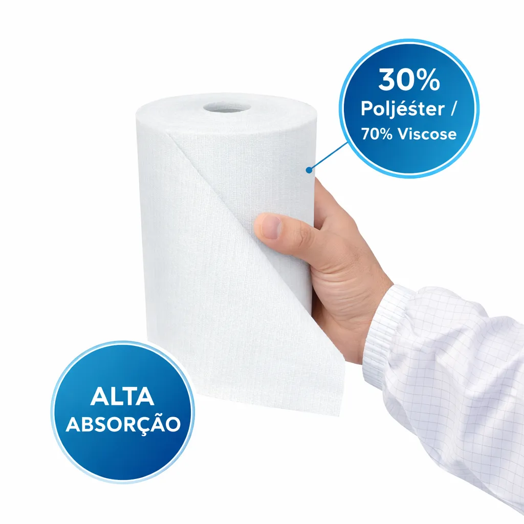 Bobina de toalhas Wiper, indicada para uso profissional em salas limpas, ambientes controlados, hospitais, indústrias e laboratórios. Confeccionada com material de alta resistência mecânica, oferece excelente desempenho em absorção de líquidos, sendo compatível com diversos produtos químicos de uso técnico e institucional.