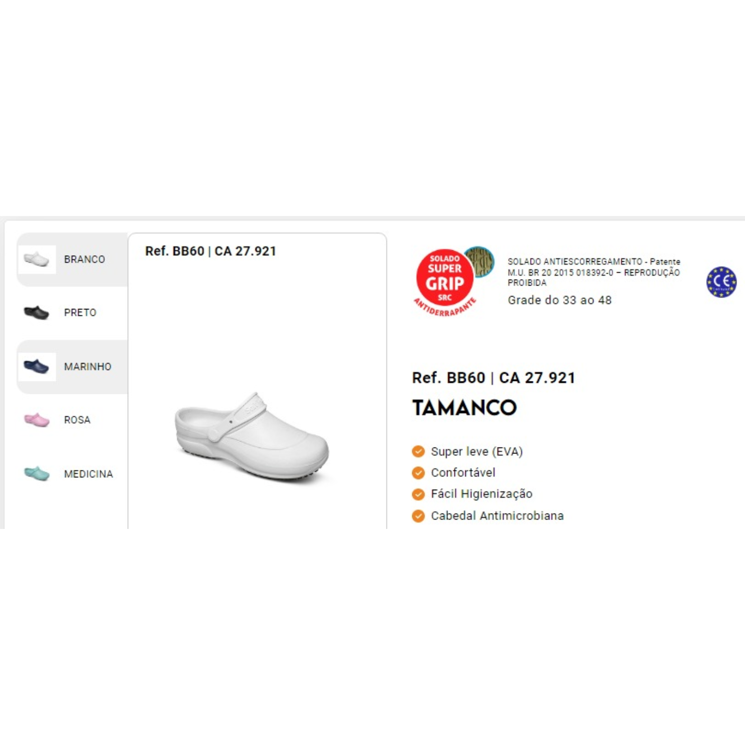 Tamanco ocupacional confeccionado em EVA, indicado para uso profissional em ambientes que exigem conforto, segurança e higiene. Modelo super leve, de fácil limpeza e com cabedal antimicrobiano. Possui solado com tecnologia SUPER GRIP SRC, proporcionando excelente desempenho antiderrapante. Disponível nos tamanhos 33 ao 48.