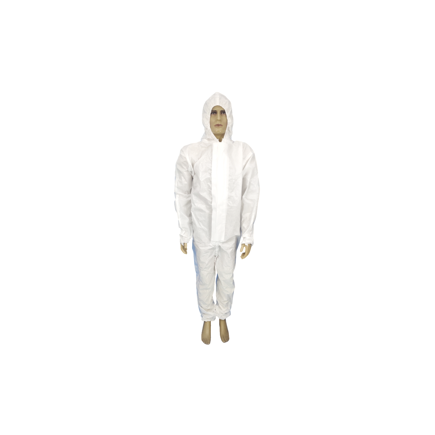 Macacão de proteção com costuras termoseladas em toda a peça, confeccionado em material técnico impermeável e resistente. Ideal para ambientes que requerem barreira física contra agentes químicos e biológicos, com versões com ou sem capuz para maior adequação ao uso.
