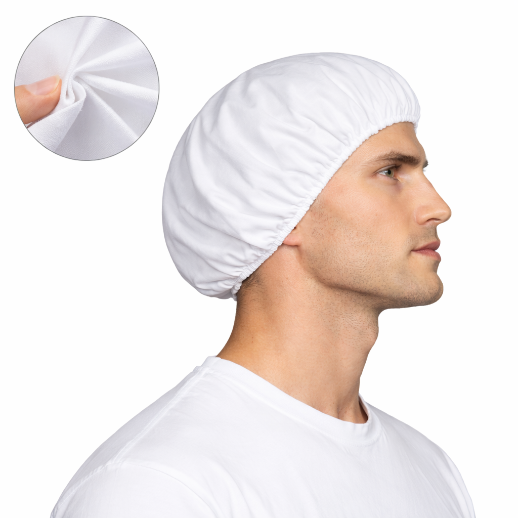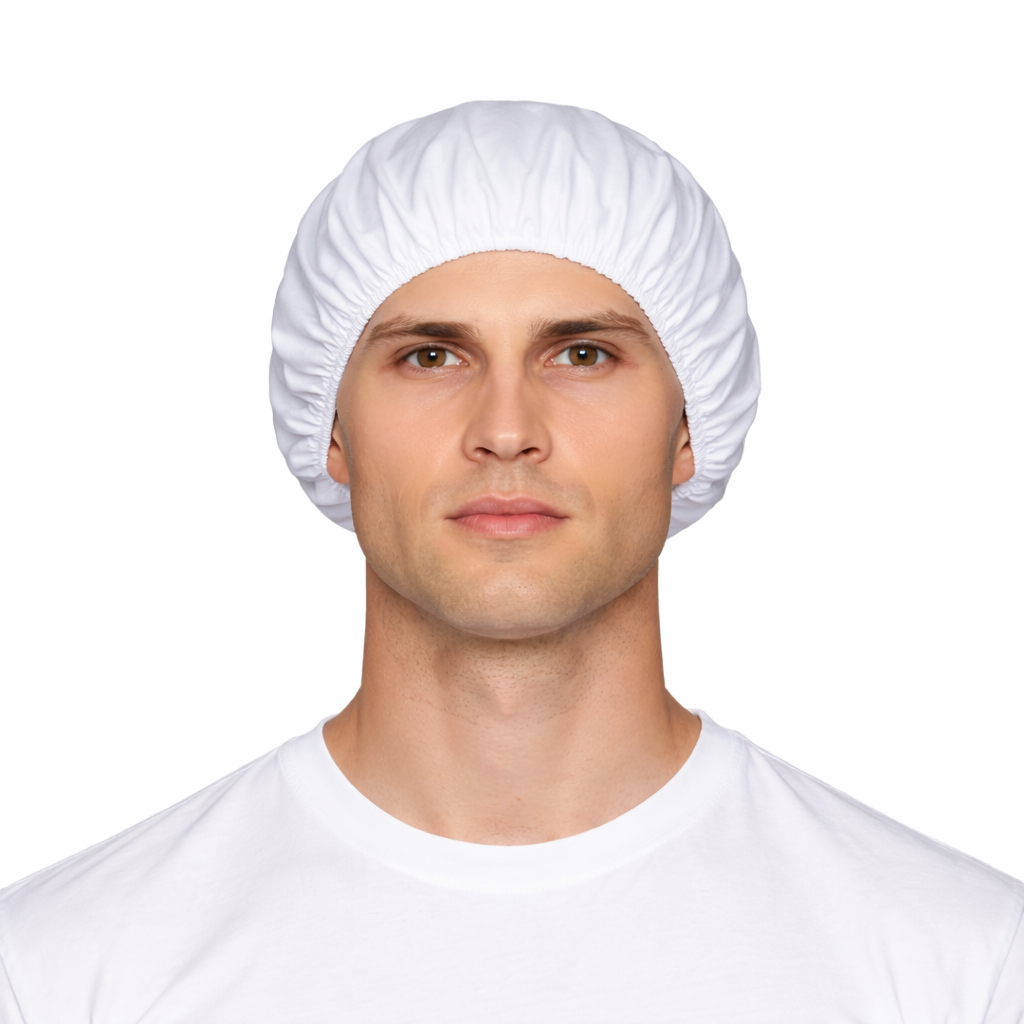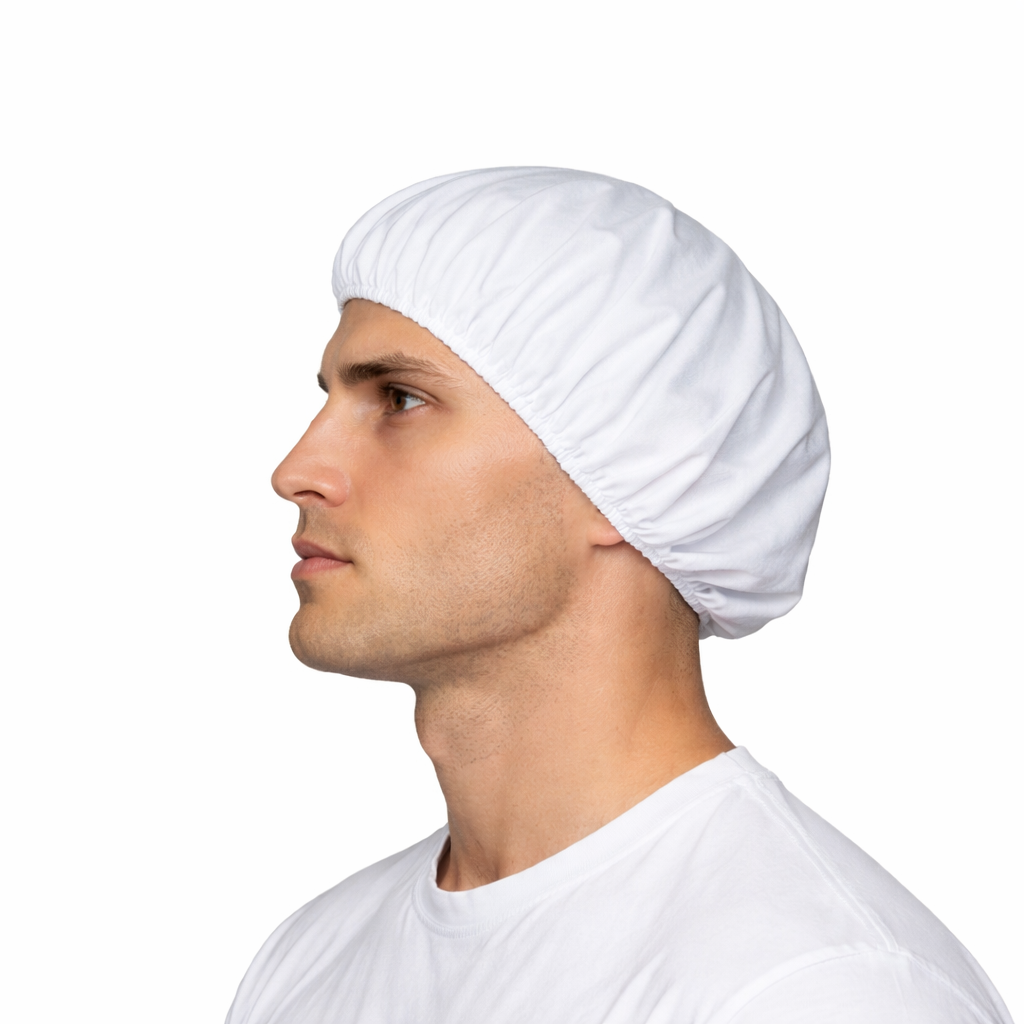 Touca lavável, confeccionada em tecido de meia malha 100% algodão, com acabamento em elástico em toda a volta. Ideal para ambientes que exigem conforto, leve controle de partículas e boa respirabilidade. Fabricada sob encomenda, é reutilizável e oferece bom desempenho em ambientes com exigência moderada de assepsia.