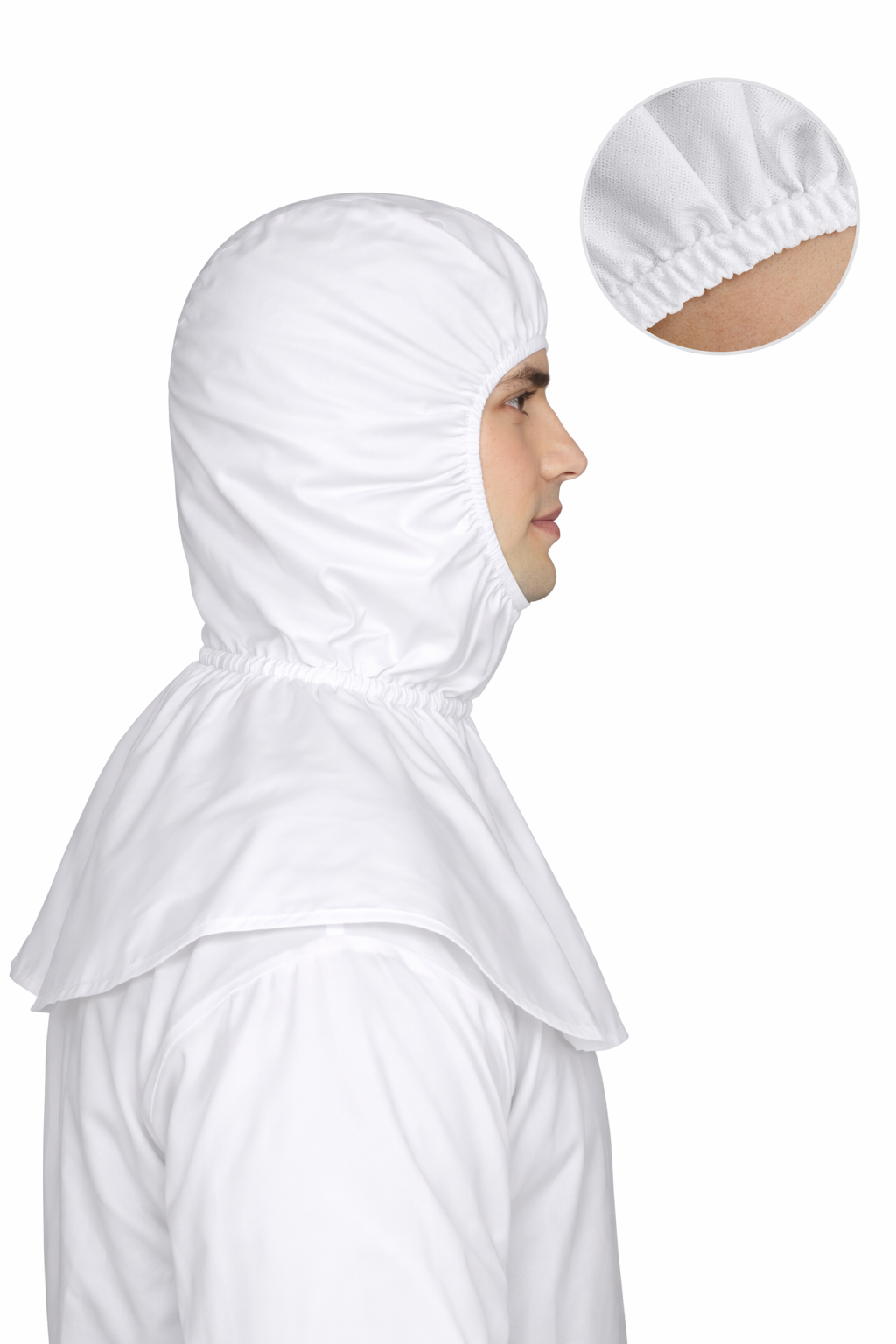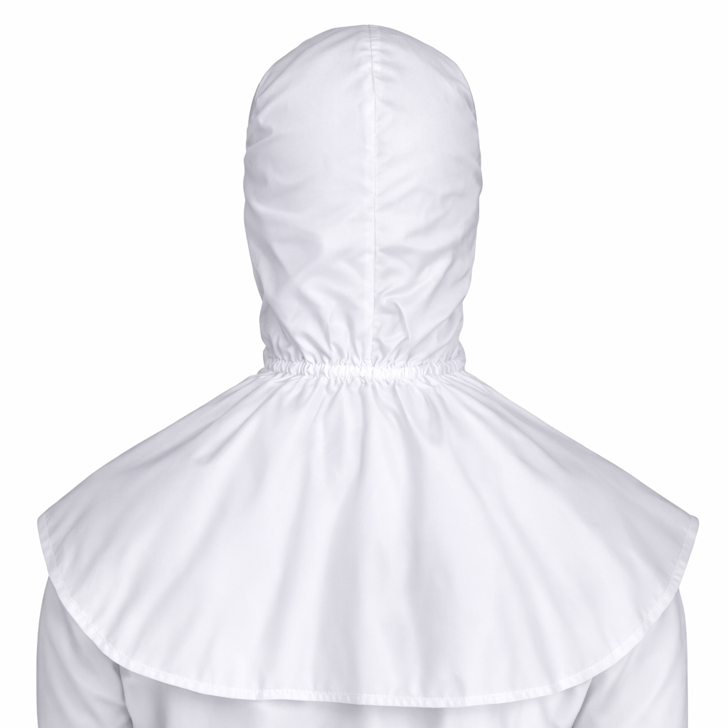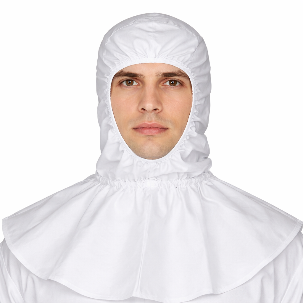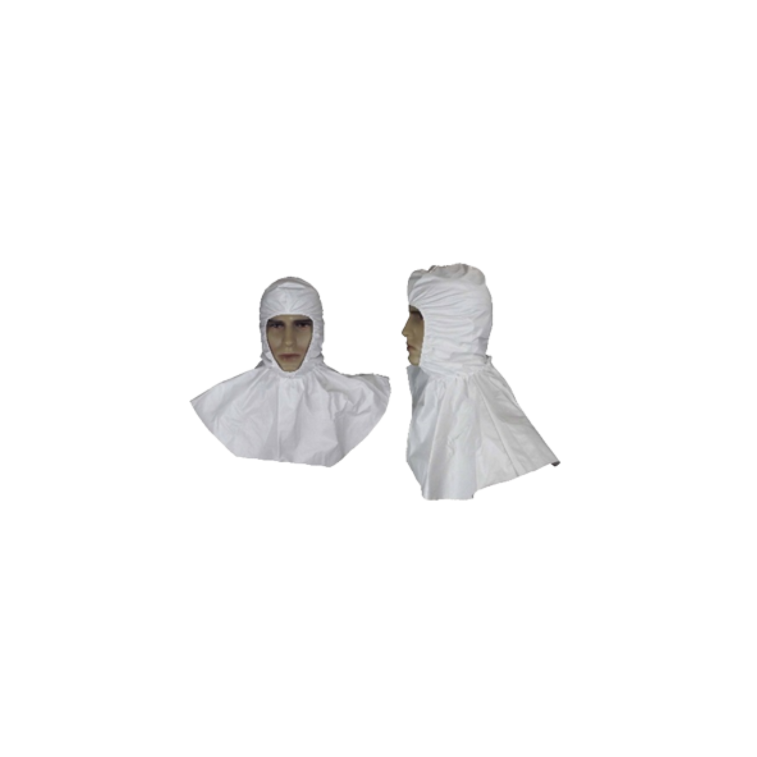 Touca de proteção individual com abertura no rosto, projetada para cobertura da cabeça e parte do tronco. Confeccionada em material impermeável de barreira química, oferece proteção contra respingos e contaminantes. Produto de uso técnico, compatível com equipamentos de proteção respiratória e visual.